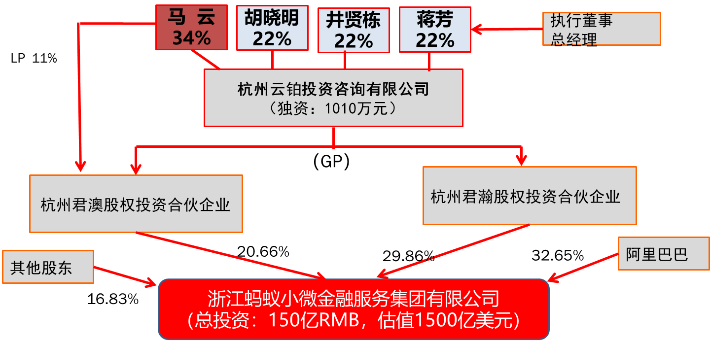 马云独资控制杭州云铂投资咨询有限公司(以下简称“杭州云铂”),而这家公司以GP身份同时获得杭州君澳股权投资合伙企业、杭州君瀚股权投资合伙企业所持股权的投票权,成为蚂蚁金服的大股东、实际控制人。