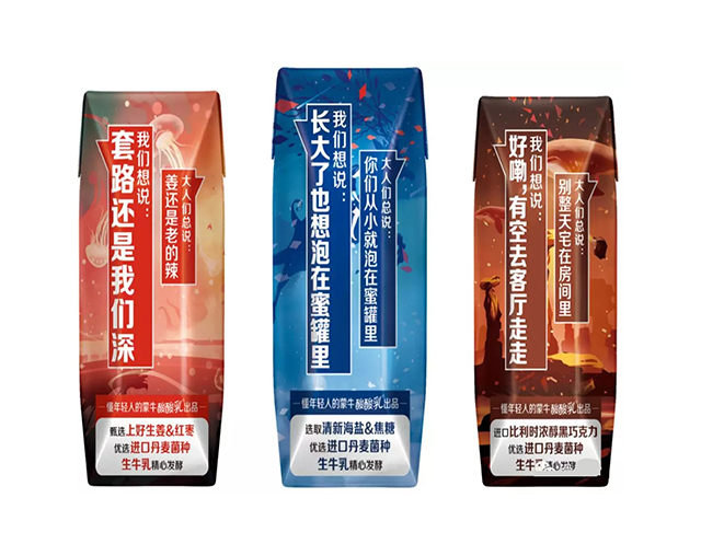 蒙牛“ZUO酸奶”主要针对“90后”“00后”,有三个口味:辣、咸、麻。突出显示青春新人类与上一辈人的区别,三种口味分别代表三种心情,用三组对话表现出产品的主打人群。如图2-9所示。