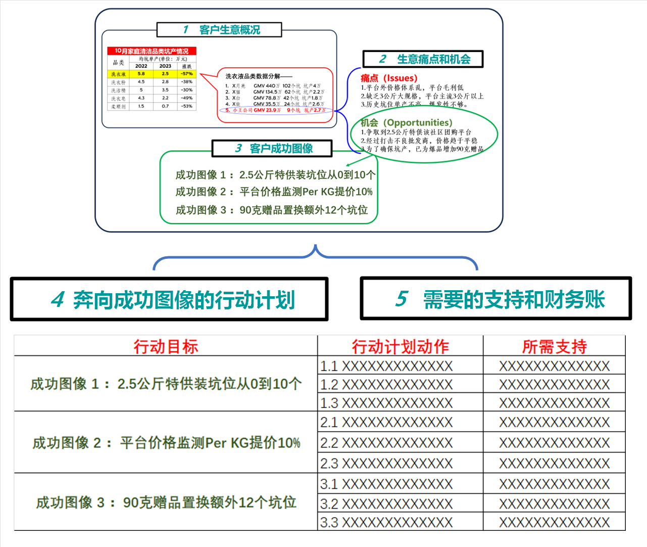 “接着,第四步和第五步就要奔着客户成功图像的具象目标制订详细的行动计划和支持清单(包括财务费用测算和提报,以便执行后的及时核销入账)。”如图5-8所示。