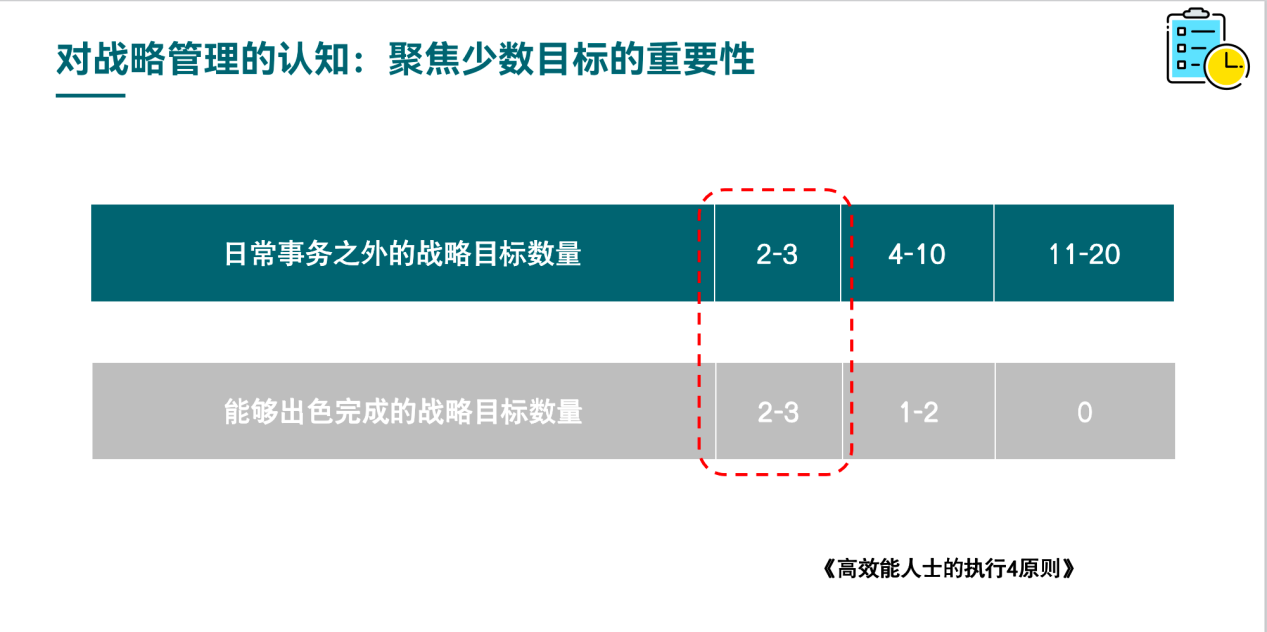 战略目标不能过多,在《高效能人士的执行四原则》这本书中写道,通过追踪研究发现,如果一个企业每年要做的事情超过3个,大概率就很难出色地百分百完成。所以,落到每年的战略工作上最好是聚焦每年1~3场最具有杠杆性意义的战役,因为这些战役需要衡量打赢与否,所以最好是既有定性又有定量,以目标的形式出现。