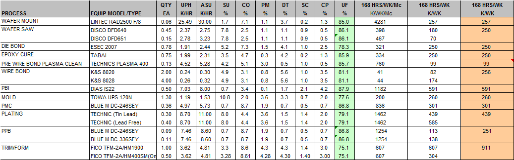 不同的工序决定标准工时的特征值不一样。贴片工序可以按“颗”计算能力;打线工序是按照产品的连线个数;MOLD工序是根据产品大小相关;粘球工序与产品大小相关。由于在这些工序中,打线工序的设备台数最多,投资最大,因此按照最初的产品组合设定了设备组合,设备的ASU是反推出来的。 例如最初产品多数是225根线,因此大约1台DB对应10台WB设备。 但当单个产品的线数从225增加到450根,每个产品WB的工时就上升一倍,但D/B等工序单个产品的工时并没有变化。产品线数没变,还是225根线,当面积减少一半,每条框架上容纳的产品就多了一倍,后线的MOLD等工序的单个产品工时会缩小一半。