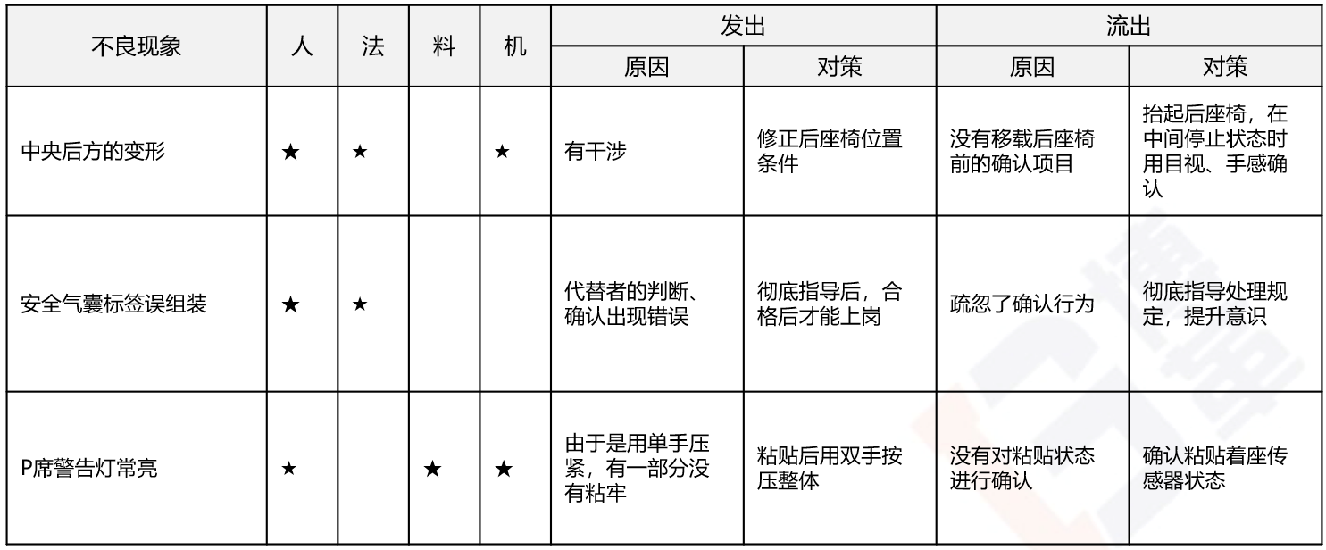 1 将不良种类按照工序、产品分类整理,明确化。