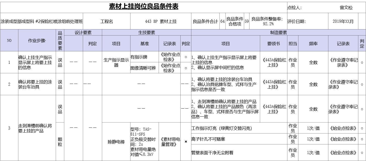 依据该工序质量特性、PFMEA、QC工程图、工艺文件、作业指导书、不良对策表等,制定该工序的良品条件。良品条件需要细分到每个作业步骤。