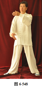 右云手:腰微含,向右外转,右脚以脚跟为轴,往右外转脚尖。左脚以脚尖为轴,往左外转脚跟。身体随腰右转面朝向西南方向; 腰向后拱,重心落于左腿,呈下倚坐式。右手随腰后拱,右下划弧摆至右侧胯旁。左手下划弧落于左腿侧旁;腰上提走弧形,左掌随腰向上走弧形,向右前穿掌,重心落于右腿上;腰微提,左脚跟随提起,向左顺开一步,掌心向右,上身微俯。腰上提身体直立,左掌抽回胸前高与乳平,掌心向里。右手弧形拉回至腹前,掌心向里。左手在上,右手在下,两臂圆撑,脊背后倚 (见图6-535至6-539)。