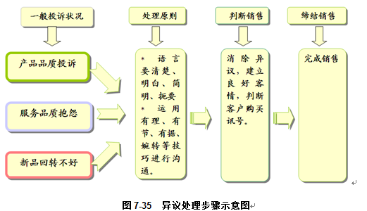 (1)异议处理:此时客户有可能不认可建议销售量,也可能对配送服务、促销资源持怀疑态度,这时,销售人员要运用客户异议处理技巧,将客户异议中隐含的需求明确化,引导客户安心订货。异议处理步骤:缓冲-探询-聆听-答复,如图7-36所示。