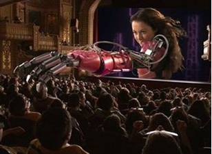 5D电影是在4D影院的基础上发展起来的下一代虚拟现实产品,它利用座椅特效和环境特效,以仿真的场景与特别的环境效果来模仿实际发生的事件,通过剧情式互动,使观众可以参与其中并全身心地融入剧情之中,体验虚幻仿真、惊心动魄的冒险旅行。具体如2-6、图2-7所示