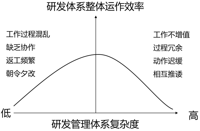 企业研发体系追求的是整体效率,并非单纯的质量目标或者规范化管理。作为研发体系的一个要素,研发管理体系规范性需要与其他要素相互匹配,过度的规范和过度的简陋,都不利于研发体系的整体效率。如图1-6所示。
