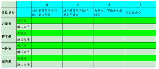 渠道与厂家的协同。在销售推进过程中,针对不同性格特征的顾客,需要采取不同的话术和技巧,通常可以将顾客分为力量型、平和型、活泼型和完美型,并进一步积累和提炼话术,这项工作是厂家发挥平台作用的一个重要内容。以下是某企业的话术矩阵: