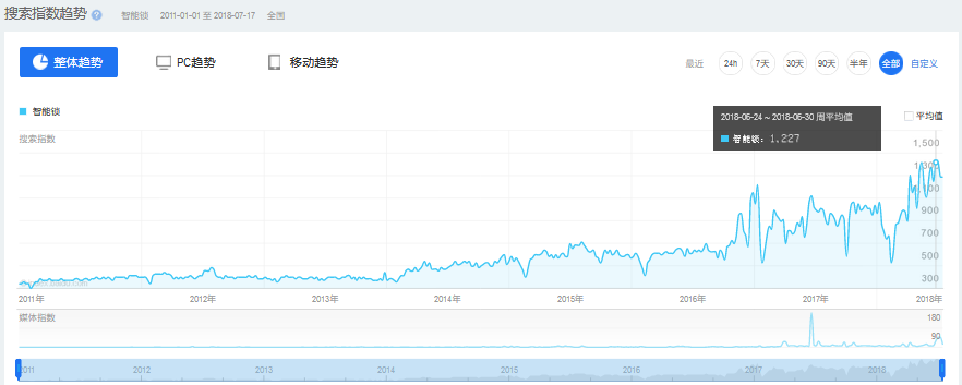 从市场容量看,空调的搜索峰值为31901,相较于成长型的智能锁,空调现在的市场容量应该远远高于智能锁具行业。