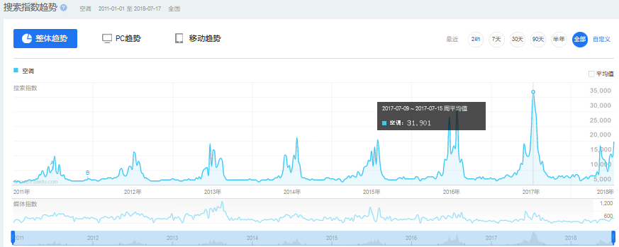 这种判断从另一个成熟行业的产品——空调也可以进行判断(如图2-2所示)。空调的搜索指数多年来形成稳定性的周期趋势,一年之中,中间大,两头小。虽然2018年相较于2011年搜索峰值有了较大上升,但应该主要得益于近几年上网人数的猛增。