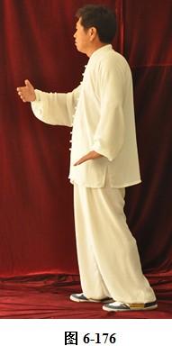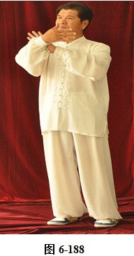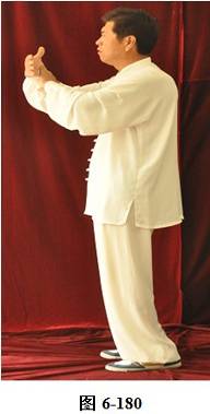 掤:右腰上提,右脚向前迈步,重心渐渐移至中间,成右弓步; 腰继续上提,右小臂同时向右上前方打掤,右掤手高与膻中穴平。左手掌心向下置于左胯旁,意念领腰继续上提,右手随之向右上撩掤,左掌跟随向上,当掤至略高于肩时,两掌翻转掌心斜相对(见图6-174至6-189)。