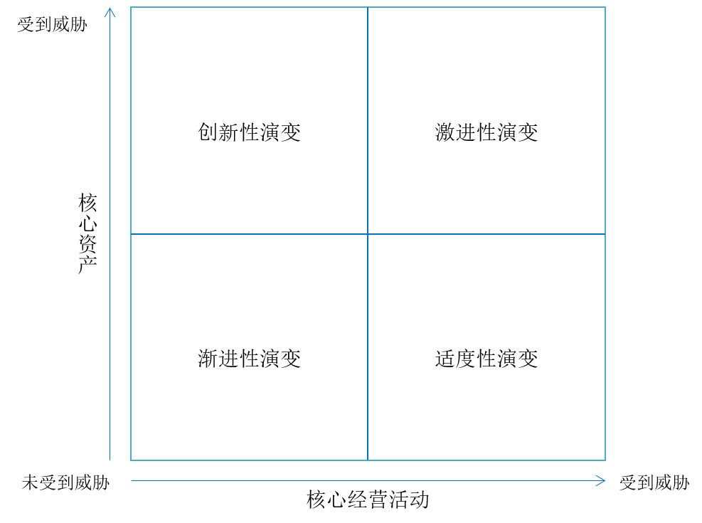 (4)激进性演变:在这一轨迹中,核心经营活动和核心资产均受到威胁,这种演变是由科技或规则的突破性进展所驱动的。这种演变一方面会使产业面临危机;另一方面也是企业重塑整个产业的良好时机。