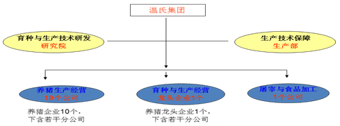 温氏模式的最大特点是构筑了一个独特的封闭式委托养殖模式。它不同于建立在市场交易关系基础上的“公司+农户”模式,也不同于完全垂直一体化的“公司+农户”模式。封闭式委托养殖模式成为温氏集团业务流程重组、价值链整合的制度基础,实现了公司和农户优势互补。温氏集团作为组织者和管理者,建立了匹配的组织架构(如图5-4所示),全程管理畜牧产业价值链的种苗、饲料、技术、保健品、畜禽饲养、销售六个环节。