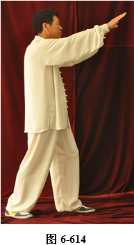 接上式,腰微拱,右腿微弯曲,重心渐渐移向右腿。腰上提向左旋转,同时左掌外旋,手心向上经右臂下向右外伸,并沿右臂向前随伸随着臂外旋,掌心翻转朝里,右拳变掌;腰下沉,随即沉肘,向胸部抽回;腰微提,随撤随臂外旋,使掌心也翻转朝里。两掌高与乳平,两臂交叉,右臂在里;腰继续拱,重心继续后移,后腿坐实;腰上提微左转,重心稍前移,两掌向左右分开,间隔一横掌的距离;腰微拱,随着两臂内旋,使掌心翻转朝下,收至小腹前,重心移落右腿,上身后倚,成下按式;两腰上提走弧形,重心前移左腿。两臂随之上抬向前掤,两掌向前按出,掌心向前,高与额头略平,成左弓步,眼神向前方远视(见图6-612至6-614)。
