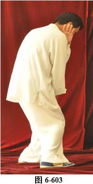 注意:在转体时,身体不可摇晃。要立身中正,松腰、松膝、松胯,腰腿都不可挺直。右脚摆莲必须由腰转带动,防止胯用力。两手拍打脚面,全凭腰转自然带动,不可故意去用手拍。