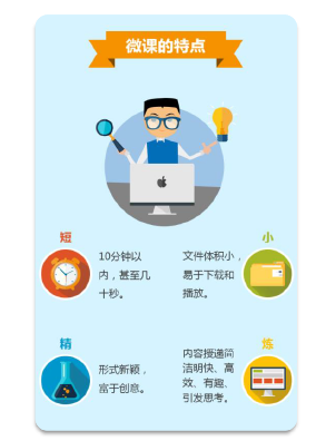 微课学习是指为了让学员在短时间内快速领悟相关知识内涵,在学习过程中运用图文、视频或动画类型的学习资源进行学习。微课具有教学时间短、视频时段短;教学选题小、内容容量小;内容精彩、教学精彩;交互性好、应用面广的特点,包括图文微课、视频微课、动画微课、互动微课等形式。