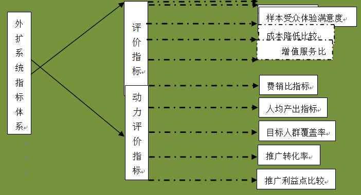 在招商计划中,外扩系统包含两个部分:一是项目运营模式本身的张力,一是推动项目运行的动力,对它们的评价指标,统称外扩系统的关键指标。在实际的操作中,由于使用习惯和行业差别,评价指标参差不齐、种类众多,将通用性的指标提炼出来,控制在5个以内,作为对这两部分评估的关键指标。