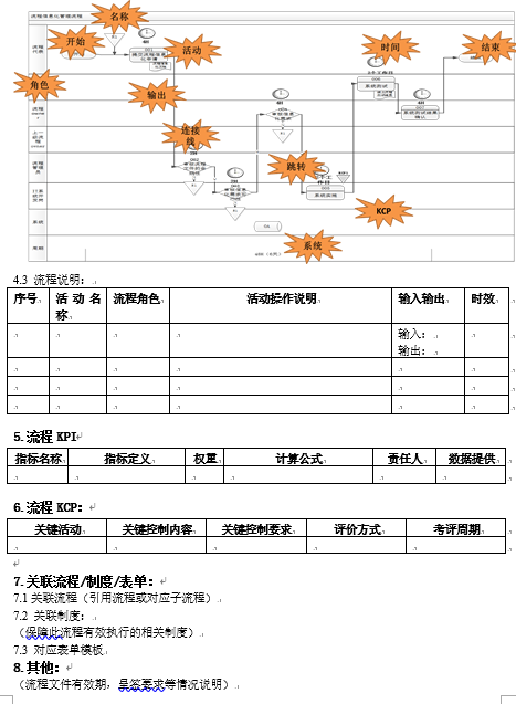 流程文件的主要内容包括流程的目的、范围、职责、架构卡、流程图、流程图、流程活动说明、流程KPI、流程KCP等内容。