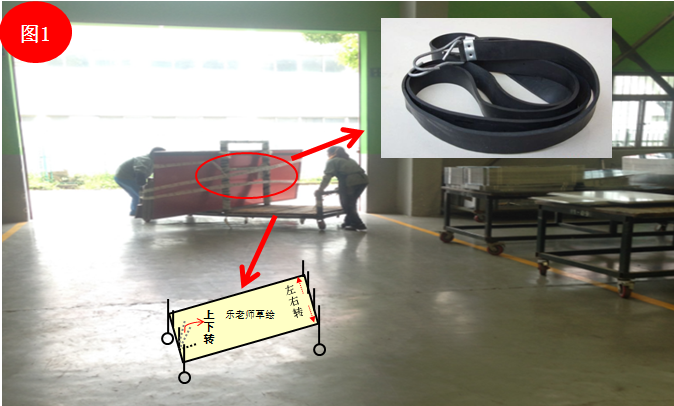 可以考虑改善运输车,如图,运输车考虑精益管理,自带卡槽,产品放卡槽里面,不用担心摔落,从根本上节省了绑松紧带的时间,卡槽还可以自由上下、左右伸缩,让整个推车变平整,又可以运输其他需要平躺的钣金。