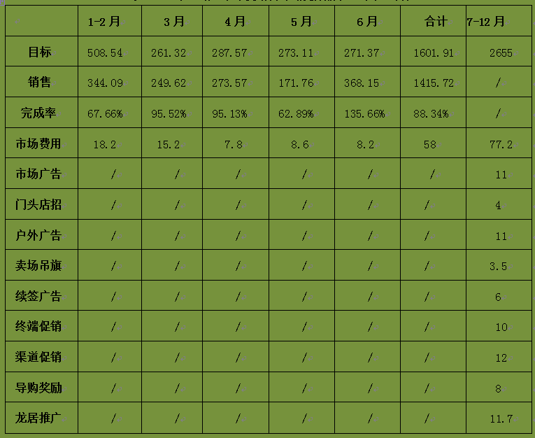 由于销售目标和费用投入方式发生变化,针对原计划的考核指标也将发生相应变化,原终端促销费用使用率考核对应下调50%以下,龙居推广场次达成率下调到83%以下。广告投放、网点调整等基础性工作,时间越早,效果越好,两大类工作完成不宜超过9月1日的行业销售旺季,终端促销、渠道促销、导购奖励及龙居推广按年度计划照常执行。