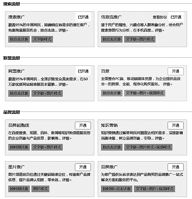 第一大类搜索流量,可以理解成能为企业网站带来流量的百度广告,其中搜索推广是本章重点,在后面章节逐一详解;另一个搜索流量产品便是百度新推出的“信息流推广”。第二大类是联盟流量,包括网盟推广和百意,可以理解为百度与其他网络平台(既有PC端也有移动端)合作,将百度广告植入这些平台上,为企业网站带来流量。第三大类品牌流量,其中品牌推广、品牌起跑线广告产品比较好理解,大品牌的公司可以每年花上百万做品牌推广广告,小品牌的公司可以花数十万元做品牌起跑线广告。第三大类的另两款广告产品:知识营销和图片推广,放在品牌流量里有点牵强。知识营销广告是指穿插在百度知识栏目中的广告,如百科、知道、知乎、文库、经验等。更适合知识性强的行业做推广,如汽车销售、培训教育、旅游等。图片推广更适合外观消费品及与图相关领域的推广,如汽车销售、服装、图库、装修、平面设计等。
