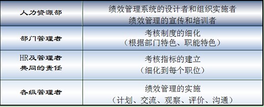 人力资源管理不仅是人力资源管理部门的事情,而是全体管理者的责任,绩效管理更是如此。绩效管理强调各级管理者的参与和管理责任,是管理者的主要管理工作,尽管不同层次和不同职能的管理者在绩效管理中的责任有所区别。与员工确定绩效计划、绩效标准、对员工进行过程监控与辅导以及对员工进行激励都是作为直接管理者的一线经理的人力资源管理责任,一线经理要承担起对人的管理的责任。