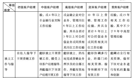 根据客户经理的个人工作能力、工作业绩以及所负责客户综合贡献额等,将银行的客户经理划分为:资深客户经理、高级客户经理(二级、一级)、客户经理(二级、一级)和助理客户经理四等六级,其他营销人员为见习客户经理。其中资深客户经理和高级客户经理按总行、省行规定执行,由市分行公开招聘和聘任,客户经理和助理客户经理由各支行组织招聘并报市分行审批后聘任。