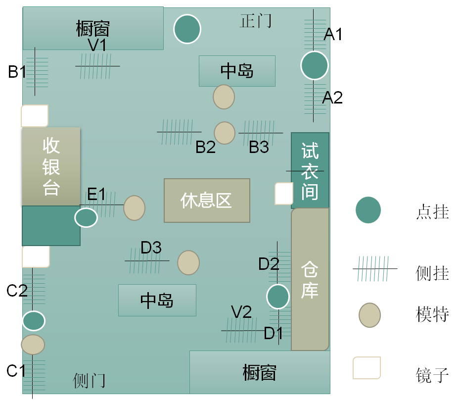 我们设定每个龙门架上连体款与上下分体款的比例为1∶2,龙门架上没有重复的SKU,图中龙门架的长度为1.8米,按每个衣架占4cm,衣架之间间隔11 cm,每个龙门架上的衣架数量约为180÷15=12个。按照上下叠挂与连体装比例1∶1计算,每个龙门架上可以挂的SKU总数约为6+6×2=18件。店面中龙门架的总数量为13个,则能够计算出龙门架上出样的SKU数为18×13=234件,加上中岛约为20的SKU,则能估算出店铺陈列的SKU数约为234+20=254。如果按照陈列的每个SKU有3个码,每个码准备2件的库存,则能计算出店铺的总数最少为254×6=1524件,也就是买手首批铺货的货品的总量约为1524件。