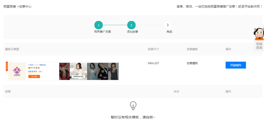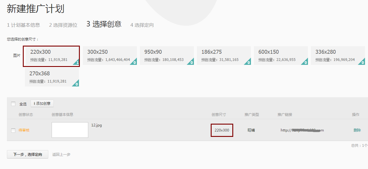 第三步,选择创意。主要是选择创意图的尺寸大小,图片的大小要自己去设计,阿里巴巴会根据你选择的位置来自动设置生成。可以选择的尺寸为:220×300像素、300×250像素、950×90像素、186×275像素、600×150像素、336×280像素、270×368像素。知道了这些,接下来就要添加创意了。