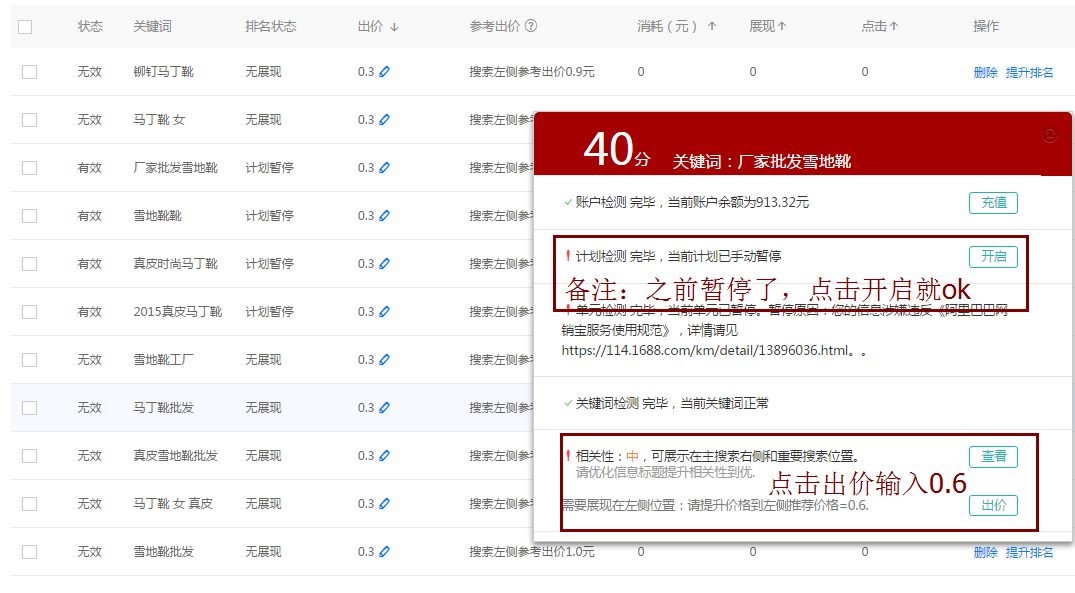 以前可能做过的计划,但是做着做着就没排名了,怎么办?这就需要及时调整自己的计划,依据系统判断的相关性及参考价格来继续做下一步调整。如果发现无展现的系统相关性好,就要及时调整价格。