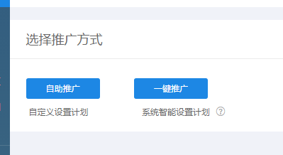 一键推广的优势在于它属于傻瓜式,不用花太多心思在上面。一键推广分为两种推广方式,一是自助推广,自定义设置计划;二是一键推广,系统智能设置计划。
