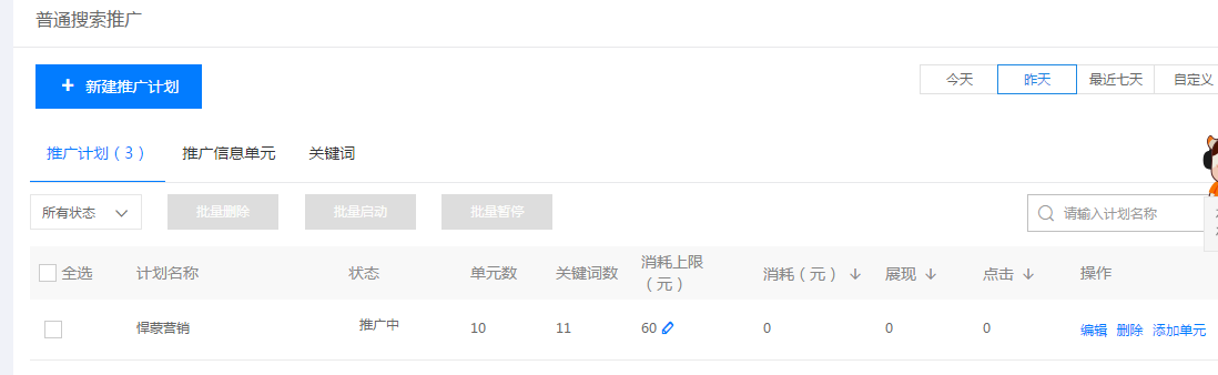 编辑好了,并不代表你通过,能有一个好的排名,或者说排到前面去,因为这个排名类似于百度竞价,随时有人会调整。我们来看一张之前做过的计划表,当我们看到状态是无效时,就证明这个词需要调整了。