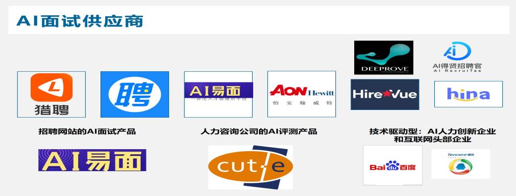AI面试创业企业,如滴孚、海纳这类公司,国外如HireVue等,包括百度、腾讯、平安等互联网公司在做这方面的探索,这些都是以技术驱动应用的代表。
