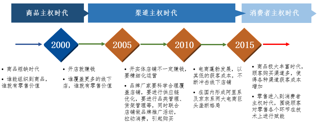 零售业经历了三个时期:商品主权时期、渠道主权时间、消费主权时期。