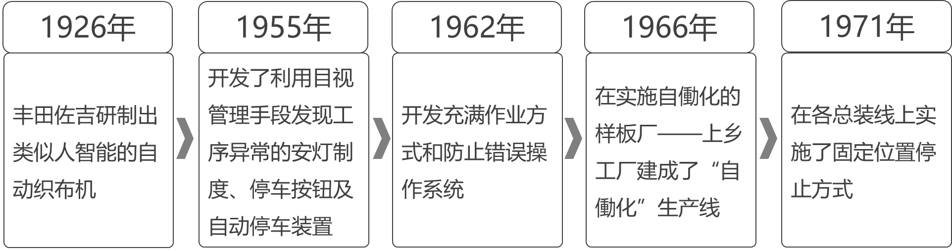 省人化 | 将人和机械的工作分开 安东原理 再发防止 | 不做设备看守人,使设备像人一样工作的思路,即使异常发生,因为机械可以自动停止,不必有人守在旁边监视机械,提高作业效率 可在设备运转时等待的时间里去做其它工序的工作,从而实现“省人化” |