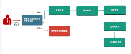 运营模式分为六个简单步骤:初步判断>初诊/检测>确诊疾病>进行治疗>开取处方药>CVS药房取药。患者进入CVS Health的步入式诊所后,先由执业护士(nurse practition或医生助理(physician assistant)进行初步判断,判断是否能为其提供所需的医疗服务,如果患者有重大疾病,则推荐其进行急诊或到医院就医,非重大疾病则由执业护士或医生助理进行初步诊断,诊断后确认疾病,之后为患者提供治疗服务,开取处方药,最后患者在CVS Health旗下药店购药。