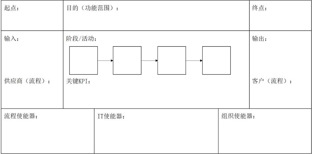 在流程架构分解模板(又称为流程分解九宫格)中,需要填写的栏位比较多,填写的过程就是分解的过程。起点、终点,是对流程边界的定义。目的(功能范围)是对流程的价值和意义进行说明。输入是对流程触发的先决条件进行说明,供应商(流程)是对应的上游流程说明。输出是对流程最终的产出进行说明,客户(流程)是对下游流程说明。阶段/活动是关键的过程分解,基于业务场景进行分解,对于流程架构颗粒度还比较粗的模块只能分解到阶段,分解到阶段的可以用模板进行二次分解,针对阶段分解;对于可以分解到活动颗粒度的,先把关键活动节点写出来即可,在做流程图设计的时候再做详细的定义。关键KPI,是对衡量该流程的绩效指标展示出来,具体的流程绩效指标定义在流程说明文件中对应的栏位进行定义。流程使能器,使用的方法、工具,如:鱼骨图、5E等。IT使能器,通常是指支撑流程执行的信息系统。组织使能器,支撑流程落地执行的组织管理制度及其它相关工作,如:培训管理制度等。