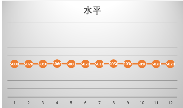水平是销售历史数据的自然反映,它是没有呈现趋势特征,也没有受到季节性影响和噪音情况下的销售状态。水平状态下,尽管每一期的需求数据都会略有差异,不过差异不是很大,那么总体来说,这些连续的需求数据会呈现“水平”的分布,徘徊在平均值附近。