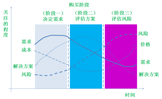 销售专家凯斯·M.依迪斯说:“在做购买决策时,风险的重要性远高于多数销售人员所能理解的程度。”他给出了购买者的关注点随时间变化的关系图,如图8-1所示。