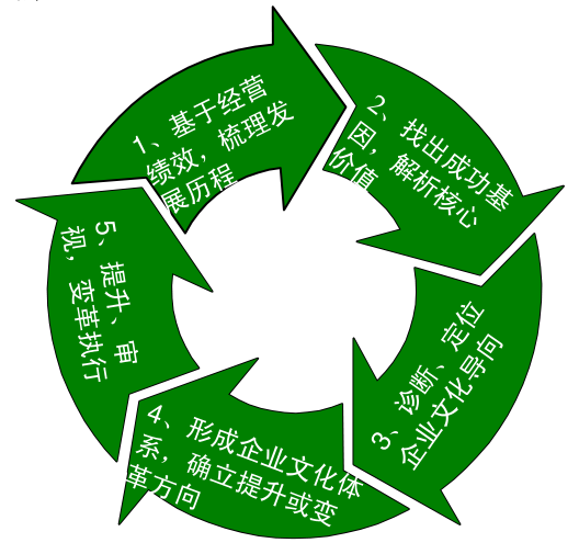(5)梳理确认:在基于中高管和全体员工的参与下,结合《企业文化诊断报告》、企业文化专业知识,深入梳理、提炼企业文化理念体系,并最终提交确认(在确认阶段也可以再讨论、再共识)。