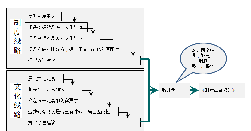 企业管理制度的文化匹配性审查一般采取“文化”和“制度”两条线路并进的技术方法。两条线路中,文化线路先行。如图2-12所示:
