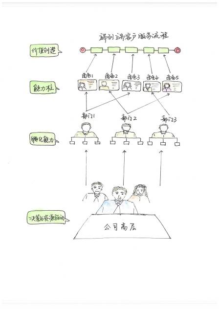 (2)角色——能力柱。在价值创造过程中,需要一些关键角色来完成,比如客户经理、商务助理、信用控制员、成本核算员、仓储管理员等。而且流程对这些角色的要求是动态变化的,增加或者减少角色,或者对角色的能力提出动态要求,这些角色实际上是完成流程运转的能力柱。