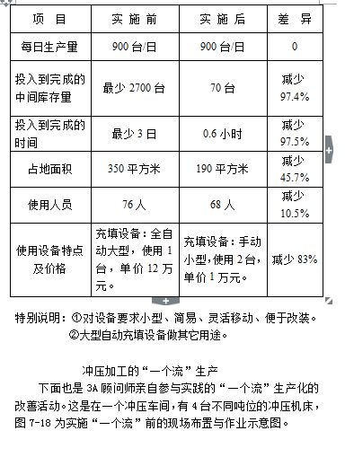 “一个流”生产作业可能使某一设备的使用效率降低(如上例中,如果4个工序用的设备动作时间不一致,会导致某台设备效率降低)。但是,对于大多数工厂来说,设备的使用效率并不是很高,据某些权威调查,一般企业的设备效率为60%左右,优秀企业在75%~85%之间。因而工厂在工序设定合理的情况下,一般不会有因效率的有所降低,导致设备能力不足的事情发生。若有此情况发生,通常可用2种方法去解决。第1种是对此台设备(或此工序)不实施“一个流”生产,我们称此设备为专用设备,设定专人,最大限度的利用此设备作业。第2种是针对某工序存在的问题,开发一些小型简易的辅助设备,提高生产效率。本例中采用第2种方法,开发了辅助装订机(制造成本1000元),成功地解决了冲压铆钉时装订效率过低的问题,使在制品在4台机车上能十分顺畅地流动。此外,即使某些设备的效率有所降低,但因为有管理简化、计划变更容易、减少场地占用、在制品数大幅度下降、减少人员、减少搬运工具等优点,“一个流”方式仍然被广泛使用。