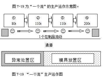 所谓“一个流”生产,是指将作业场地、人员、设备(作业台)合理配置,使产品在生产时,每个工序最多只有一个在制品或成品,从生产开始到完成之前,没有在制品放置场地及入箱包装的作业。