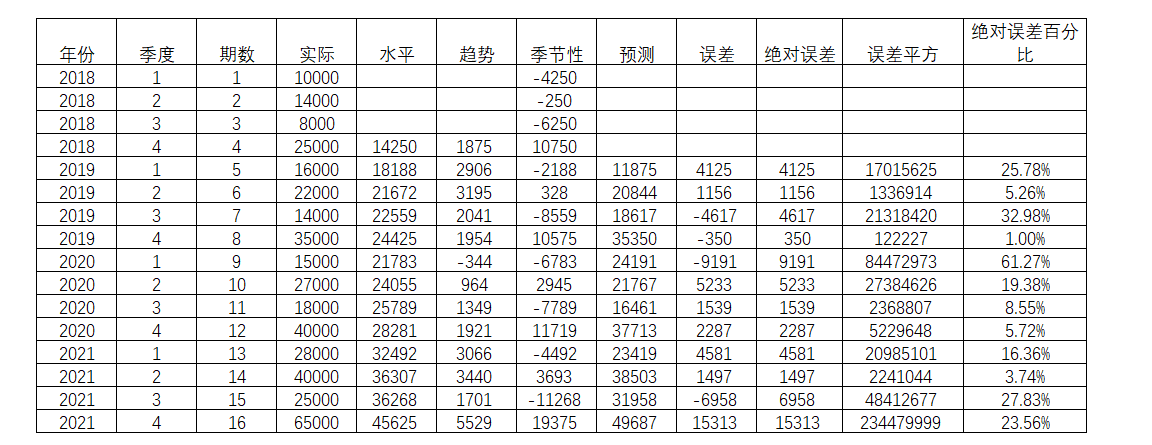 对相关期数的实际值和预测值进行误差等的计算,得到相关的数据值。