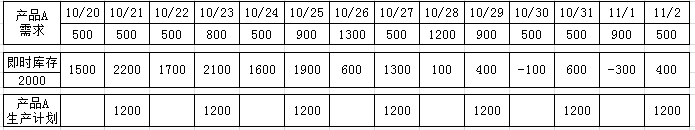 产品A的现有库存量为2000kg,安全库存量为2000kg,产能为1200kg/批,生产周期为2天。它的现有订单:10月23日交付300kg、10月25日交付400kg、10月26日交付800kg、10月28日交付700kg、10月29日交付400kg、11月1日交付400kg,每日订单交付量还会有额外的约500kg。它的排产计划应该是什么样的?它的差异问题应该如何解决?如表2-13所示。