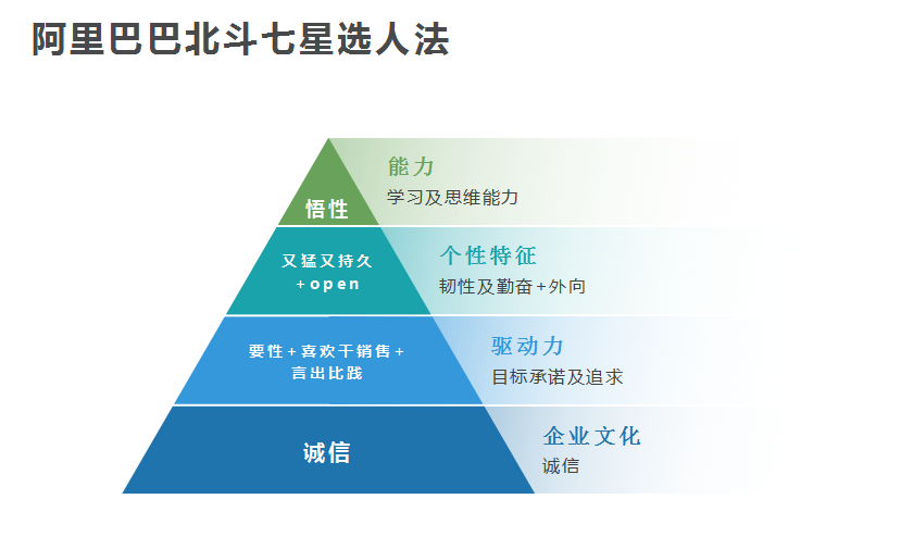 北斗七星,由三个能力层面和一个底层要求构成,由7个关键词对应7星。最底层是“诚信”;接下来是驱动力包括要性、喜欢干销售、目标忠诚;再往上是个性特质:“又猛又持久”和“open”,最上面是“悟性”。再加上阿里巴巴销售的使命:完成销售业绩。根据清晰的人才画像,招聘非常顺利,快速搭建了一个坚固的铁军销售团队,并为阿里巴巴业务成长贡献了最坚实的力量。