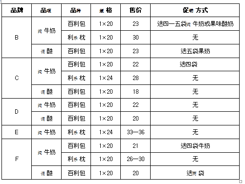 (2)果味酸奶目前执行“七送一”政策,按目前经销商普遍发货价16元计算,毛利空间3元/件,这也是对特级纯牛奶推广积极性不高的原因。