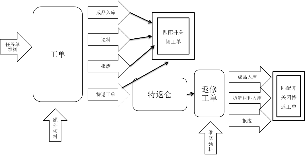 基于工单的产线物流闭环管理是以仓库为基线展开的,即以工单为管理单位,用所有领料(任务令领料、超额领料、返修领料)与最终出货(包括成品、报废品、退料、拆解材料入库)进行匹配,有问题查问题,没问题才关闭工单。图7-2是笔者曾经设计过的一个案例原理图。