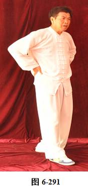 接上式,腰微下沉,蹬出的右脚随腰下沉落地,脚跟先着地, 重心仍在左腿上。腰上提,重心随即前移,右脚踏实,外开的两臂随之向内并拢,手心朝上,相距略小于肩;腰向后拱,呈后倚式, 重心移落左腿上。两臂随腰后拱下倚之势,向下收回至两胯外侧旁, 掌心仍向上,后腿弯曲;腰上提,重心仍在左腿不变,两臂随腰上提之势,两手继续向后划圆弧,由胯两侧腰后向上至两手手心摸到后腰止,左腿随腰上提稍微直立。腰向后下松沉,左腿随之还原呈弯曲状后倚,两手随之抚摸后腰向下至臀部;腰上提走弧形,两手随向前变松拳,随前臂内旋,向前上方划圆,重心移落右腿,呈右弓步,用两拳灌击对方双耳处,眼神向前平视(见图6-290至6-292)。